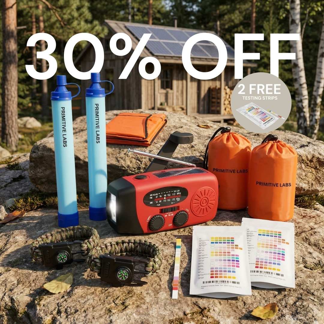 The first 72 hours are everything. Emergency radio for real-time alerts, water filtration, shelter, and signaling for two people — plus FREE water test strips so you know what you're drinking.